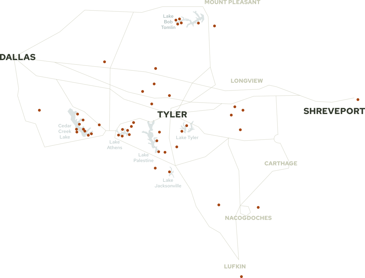We proudly serve lakeside communities such as Lake Athens, Cedar Creek, and Lake Cypress Springs — as well as ranches, and residential properties throughout East Texas, including Tyler and beyond. Many of our clients from Dallas and neighboring areas choose Landvisions for our deep understanding of local terrain and eye for native landscape preservation.