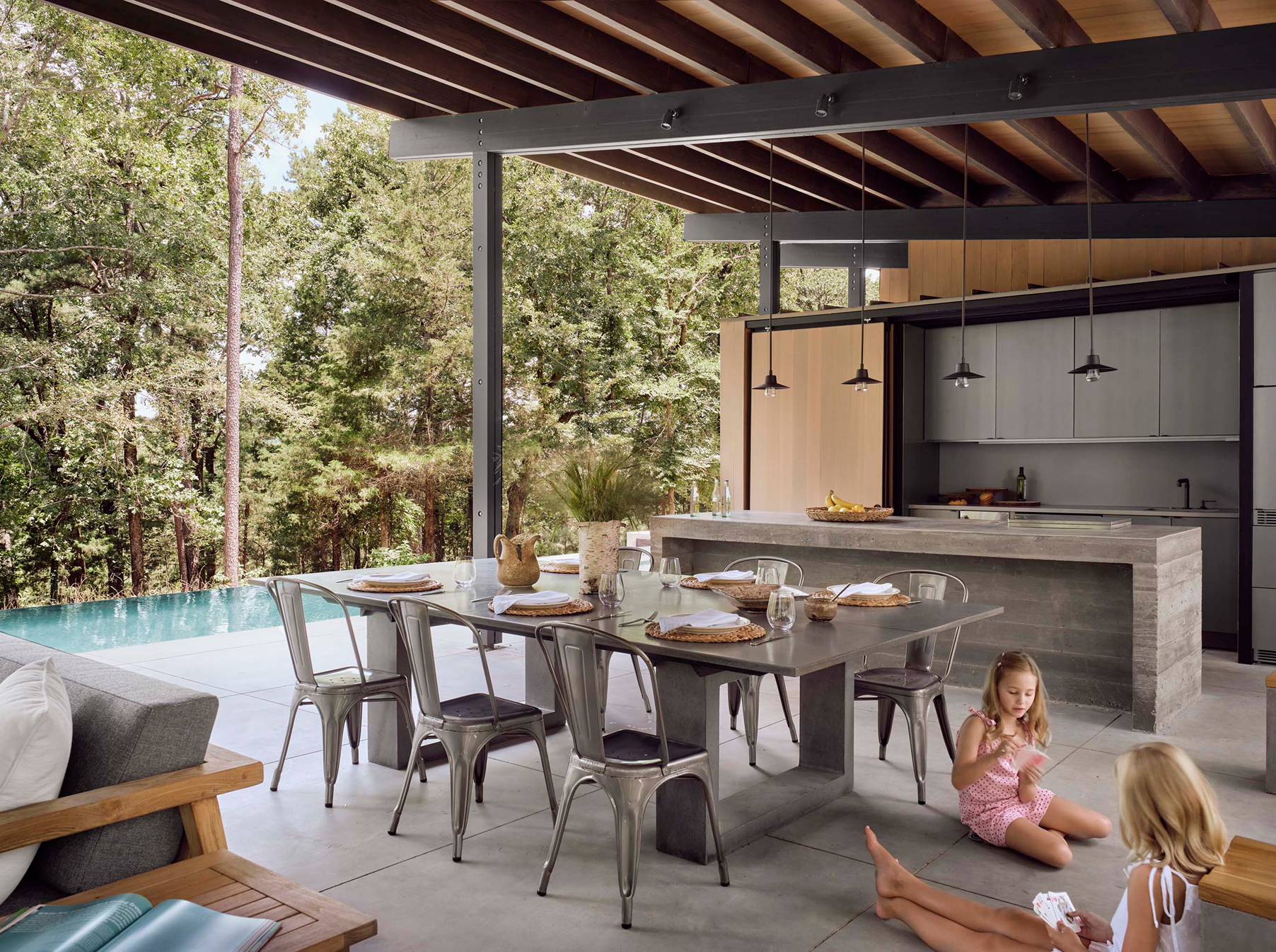 Situated on a five acre peninsula in Cross Pines Ranch, this luxurious retreat is part of a conservation easement protecting dense stands of pines, placid lakes, and expansive views, all of which capture the essence of East Texas living. Here the Dobrient family, who live in Dallas, envisioned creating a weekend getaway where their family could enjoy the outdoors while spending quality time together.
